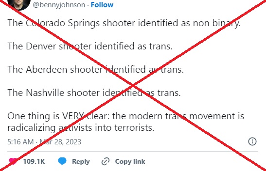 มีข้อมูลบิดเบือนเผยแพร่ทาง Twitter ในสหรัฐอเมริกา โดยอ้างว่าเหตุกราดยิง 4 ครั้งในสหรัฐอเมริกา ได้แก่ Aberdeen shooting ปี 2018 Denver shooting ปี 2019 Colorado Springs shooting ปี 2022 และ Nashville school shooting ปี 2023 ล้วนมีผู้ก่อการเป็นคนข้ามเพศ (Trans) และคนที่ไม่ระบุเพศ (Non-binary) แสดงให้เห็นว่าขบวนการเรียกร้องสิทธิคนข้ามเพศยุคใหม่ ได้เปลี่ยนนักเคลื่อนไหวทางสังคมให้กลายเป็นผู้ก่อการร้าย