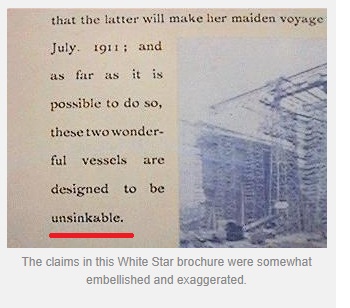 นิตยสาร The Titanic Commutator ของสมาคม Titanic Historical Society ประจำเดือนกุมภาพันธ์ 1993 พบหลักฐานใบปลิวของบริษัท White Star Line สายการเดินเรือของอังกฤษและเจ้าของเรือ Titanic ที่โฆษณาด้วยข้อความว่า เรือ Olympic และ Titanic ถูกออกแบบมาให้ “ไม่มีวันจม” (these two wonderful vessels are designed to be unsinkable)