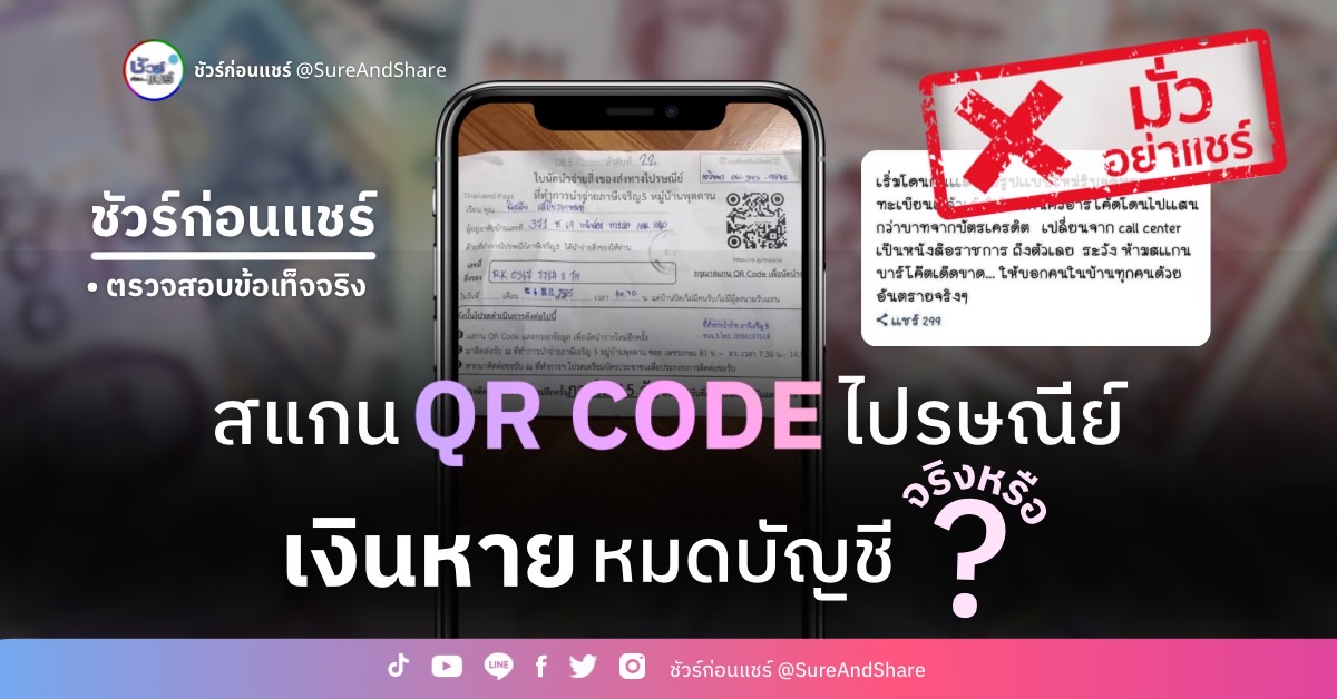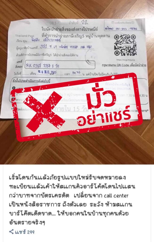 👉 ศูนย์ชัวร์ก่อนแชร์ ตรวจสอบกับ บมจ.ไปรษณีย์ไทย ยืนยันว่า ข้อมูลดังกล่าวเป็นข้อมูลเท็จ รูปภาพเอกสารที่แชร์กันเป็นเอกสารจริงของไปรษณีย์ไทย เขตนำจ่ายภาษีเจริญ 5 ซึ่งเป็นแผนกในสังกัดของไปรษณีย์ภาษีเจริญที่ได้ส่งใบนัดนำจ่ายไว้ที่บ้านผู้รับที่ไม่มีคนอยู่บ้านและไม่สะดวกรับ ให้สามารถติดต่อนัดหมายกับบุรุษไปรษณีย์ให้นำจ่ายพัสดุได้ใหม่อีกครั้ง แต่เพื่อเป็นการป้องกันมิจฉาชีพ ไปรษณีย์ไทยได้ยกเลิกนัดหมายเวลาในการนำจ่ายใหม่ผ่านระบบ QR CODE โดยจะติดต่อผู้รับเพื่อนัดหมายนำจ่ายใหม่ผ่านโทรศัพท์
