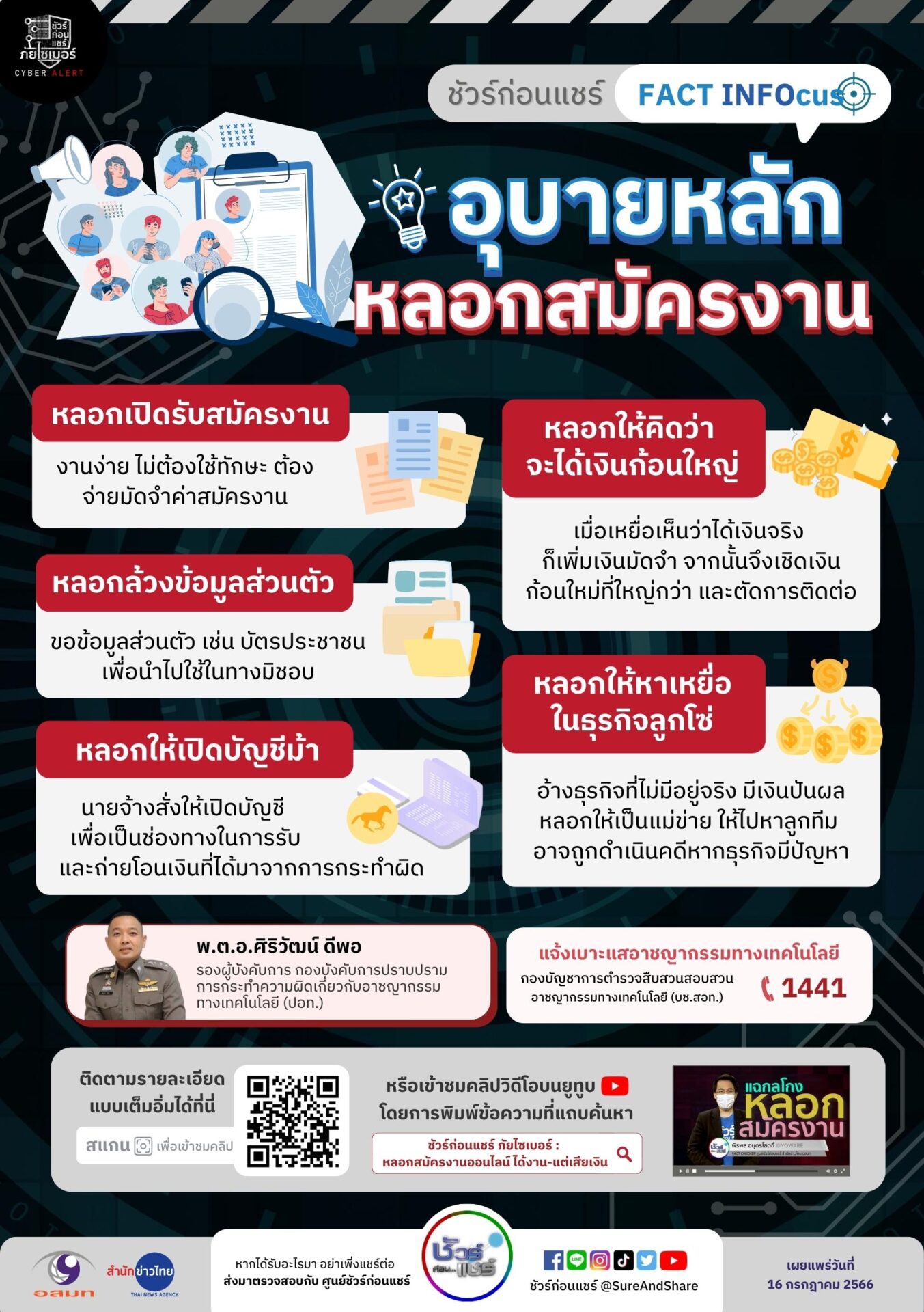 เตือนภัยระวังมิจฉาชีพหลอกสมัครงาน กิจกรรมต่าง ๆ ที่นำมาหลอกลวงเหยื่ออาศัยความไม่รู้ และความโลภของประชาชนเป็นเครื่องมือ ใช้เทคโนโลยีเข้ามาช่วยเพื่อเพิ่มความน่าเชื่อถือ ไม่เลือกอายุ หรือเพศของเหยื่อ ทุกคนทุกอาชีพสามารถตกเป็นเหยื่อได้หมด เพราะฉะนั้นการทำกิจกรรม หรือธุรกรรมใดๆ บนโลกออนไลน์ต้องรู้เท่าทันกลโกงของมิจฉาชีพและมีสติอยู่เสมอ