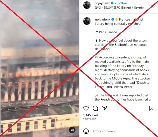 มีการแชร์ภาพที่อ้างว่าผู้ชุมนุมประท้วงทำการเผาหอสมุดที่ใหญ่ที่สุดในฝรั่งเศส