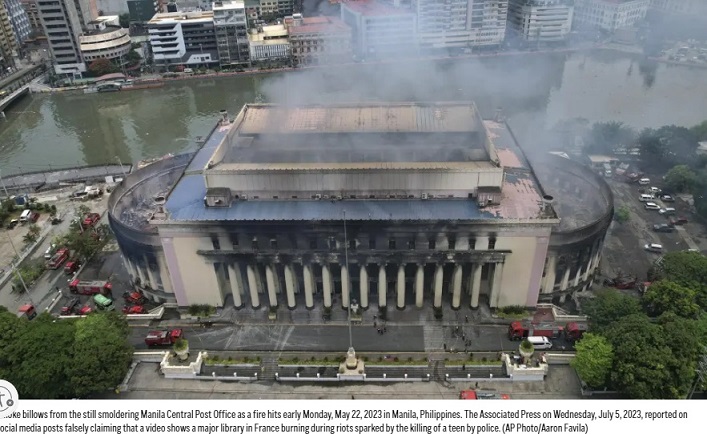 ภาพที่ถูกแชร์คือเหตุเพลิงไหม้ที่ทำการไปรษณีย์กลางกรุงมะนิลา (Manila Central Post Office) ประเทศฟิลิปปินส์ เมื่อวันที่ 22 พฤษภาคม 2023 ที่ผ่านมา