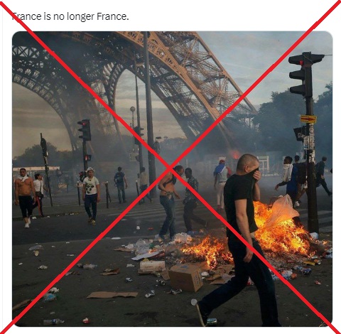 มีการแชร์ภาพที่อ้างว่าผู้ชุมนุมประท้วงรวมตัวกันจุดเพลิงที่บริเวณหอไอเฟล สัญลักษณ์ของกรุงปารีสและประเทศฝรั่งเศส