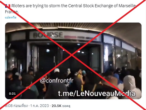 จากการตรวจสอบพบว่า สถานที่ในคลิปวิดีโอที่ถูกแชร์ไม่ใช่ตลาดหลักทรัพย์ แต่เป็นด้านหน้าของ Centre Commercial Bourse ห้างสรรพสินค้าในเมืองมาร์กเซย์ โดยคลิปวิดีโอถูกเผยแพร่เมื่อวันที่ 1 กรกฎาคม 2023 ที่ผ่านมา