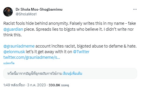โชลา มอส-ช็อกบามิมู ประณามการบิดเบือนข้อมูลผ่านทาง Twitter พร้อมย้ำว่าตนเองไม่มีความคิดหรือเคยเขียนบทความสนับสนุนการใช้ความรุนแรงเพื่อสร้างความเท่าเทียมในสังคม