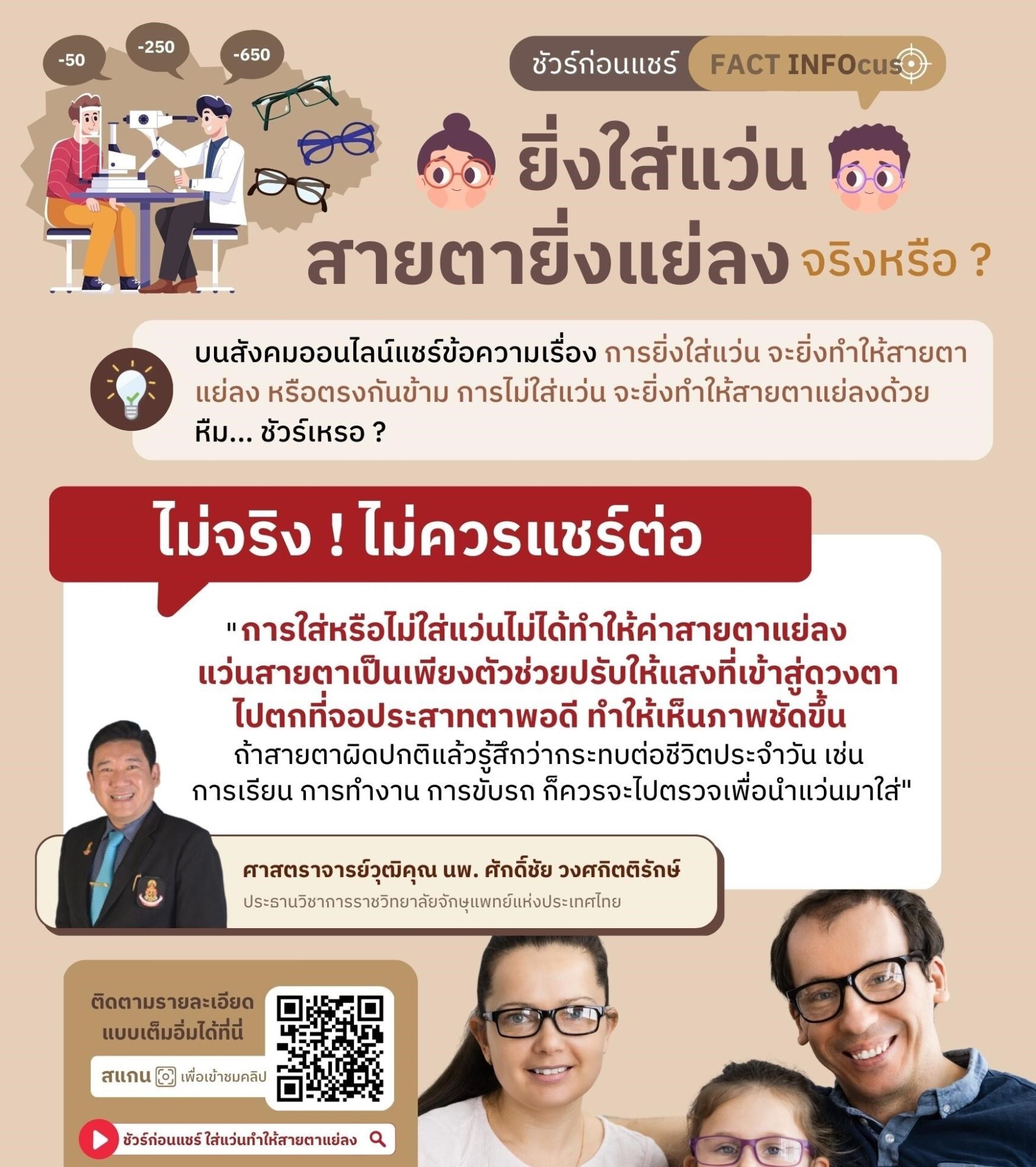 “การใส่หรือไม่ใส่แว่นไม่ได้ทำให้ค่าสายตาแย่ลง แว่นสายตาเป็นเพียงตัวช่วยปรับให้แสงที่เข้าสู่ดวงตาไปตกที่จอประสาทตาพอดี จึงทำให้เห็นภาพชัดขึ้นถ้าสายตาผิดปกติแล้วรู้สึกว่ากระทบต่อชีวิตประจำวัน เช่น การเรียน การทำงาน การขับรถ ก็ควรจะไปตรวจเพื่อนำแว่นมาใส่”