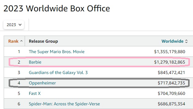 ข้อมูลจากเว็บไซต์ Boxofficemojo เมื่อวันที่ 21 สิงหาคม 2023 ระบุว่า Barbie ทำเงินจากการฉายรอบโลกประมาณ 1,279 ล้านดอลลาร์สหรัฐอเมริกา รั้งตำแหน่งภาพยนตร์รายได้อันดับที่ 2 ของปี 2023 ส่วน Oppenheimer ทำรายได้จากการฉายรอบโลกประมาณ 717 ล้านดอลลาร์สหรัฐอเมริกา รั้งตำแหน่งภาพยนตร์รายได้อันดับที่ 4