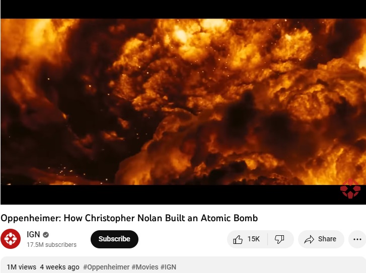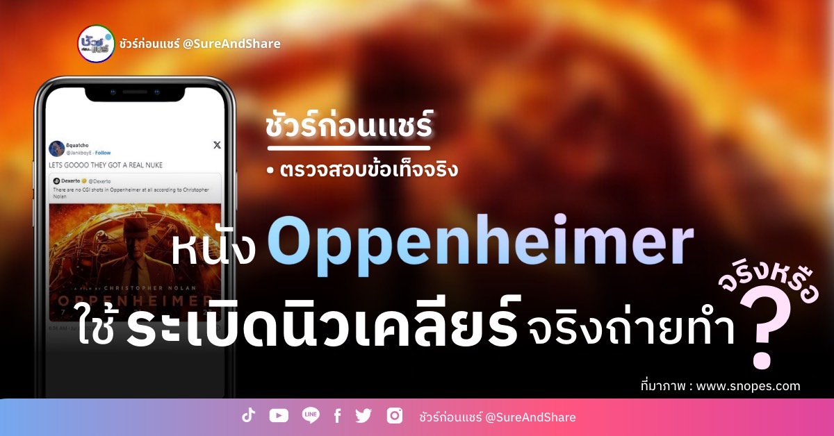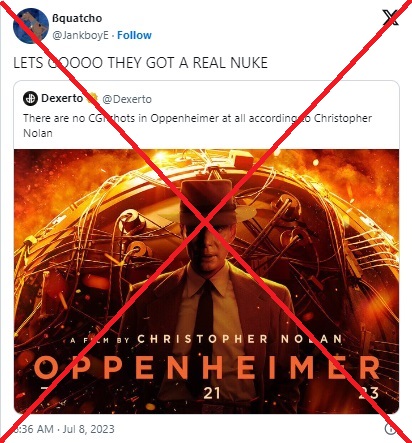 มีข้อมูลบิดเบือนเผยแพร่ทางสื่อสังคมออนไลน์ในต่างประเทศ ที่อ้างว่า มีการจุดระเบิดนิวเคลียร์ในกองถ่ายภาพยนตร์ Oppenheimer หนังชีวประวัติ เจ. โรเบิร์ต ออปเพนไฮเมอร์ นักวิทยาศาสตร์ผู้ให้กำเนิดระเบิดนิวเคลียร์ เนื่องจาก คริสโตเฟอร์ โนแลน ผู้กำกับภาพยนตร์ที่ชื่นชอบความสมจริงของการถ่ายทำภาพยนตร์ ไม่ต้องการใช้เทคนิคการสร้างภาพด้วยคอมพิวเตอร์เพื่อจำลองฉากการทดลองระเบิดนิวเคลียร์ในผลงานของตนเอง