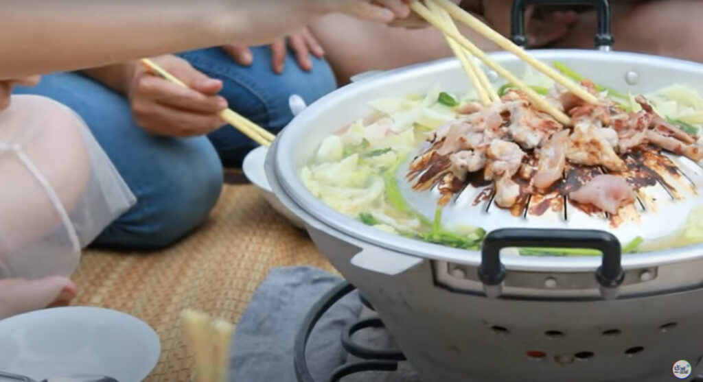 - ใช้ตะเกียบคู่เดียวแต่สลับด้านกันใช้งาน คือ ด้านหัวตะเกียบใช้คีบหมูดิบ ด้านปลายตะเกียบใช้คีบหมูสุก