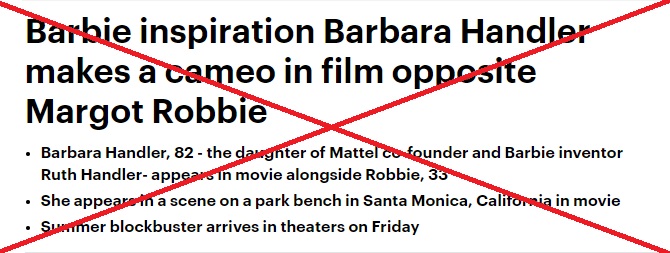 มีข้อมูลสร้างความเข้าใจผิดเผยแพร่ทางสื่อสังคมออนไลน์ในต่างประเทศ ที่อ้างว่า บาร์บารา แฮนด์เลอร์ บุตรสาวของ รูธ แฮนด์เลอร์ ผู้ให้กำเนิดตุ๊กตาบาร์บี้ ปรากฏตัวในหนัง Barbie ในฉากที่ มาร์โก ร็อบบี นางเอกของเรื่อง ได้สนทนากับหญิงชราผู้เป็นปริศนาของเรื่อง
