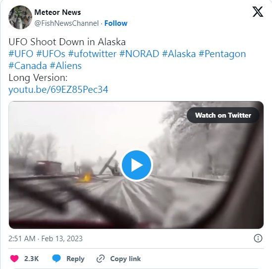 ผู้โพสต์อ้างว่า ซาก UFO/UAP ที่อยู่ในคลิป น่าจะเกี่ยวข้องกับรายงานที่กองทัพสหรัฐอเมริกายิงวัตถุต้องสงสัยที่บินเหนือน่านฟ้าในรัฐอะแลสกาช่วงเดือนกุมภาพันธ์ที่ผ่านมา