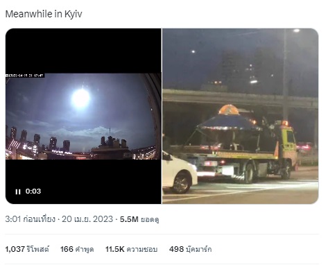 ส่วนปรากฏการณ์แสงประหลาดที่กรุงเคียฟเมื่อเดือนเมษายน 2023ได้รับการคาดการณ์ว่า น่าจะเป็นแสงจากอุกกาบาต ที่เผาไหม้ในชั้นบรรยากาศระหว่างตกลงสู่พื้นโลก