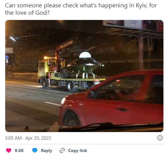 ภาพและคลิปวิดีโอชิ้นแรกถ่ายที่ถูกแชร์ คือภาพถ่ายรถบรรทุกกำลังขนย้ายวัตถุคล้าย UFO/UAP ขนาดเล็กบนถนนในกรุงเคียฟ ประเทศยูเครน ซึ่งถูกนำไปเชื่อมโยงทางโลกออนไลน์ว่า วัตถุดังกล่าวคือที่มาของการเกิดปรากฏการณ์แสงประหลาดเหนือน่านฟ้ากรุงเคียฟ เมื่อคืนของเดือนเมษายน 2023