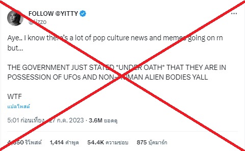 มีข้อมูลบิดเบือนเผยแพร่ทาง X (Twitter) ในสหรัฐอเมริกา เมื่อ Lizzo แร็ปเปอร์สาวชื่อดังชาวอเมริกาอ้างว่า รัฐบาลสหรัฐอเมริกาให้การภายใต้คำสาบานว่า พวกเขาครอบครอง UFO/UAP และร่างของมนุษย์ต่างดาวหรือเอเลี่ยนสำหรับโครงการวิจัยของกองทัพ กลายเป็นข้อความที่ถูกส่งต่ออย่างแพร่หลาย ทำยอดวิวกว่า 2.5 ล้านครั้งและยอดไลก์ 50,000 ครั้งในเวลาแค่วันเดียว