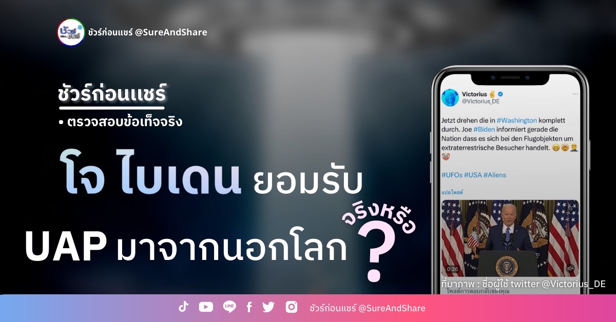 มีวิดีโอข้อมูลบิดเบือนเผยแพร่ทางสื่อสังคมออนไลน์ในต่างประเทศ ที่อ้างว่า โจ ไบเดน ประธานาธิบดีสหรัฐอเมริกา ออกแถลงการณ์ยอมรับว่ามีมนุษย์ต่างดาวเดินทางมาพร้อมกับ UFO/UAP เมื่อช่วงเดือนกุมภาพันธ์ที่ผ่านมา จนเป็นวิดีโอที่ทำยอดรับชมทาง TikTok มากกว่า 1.5 ล้านครั้ง