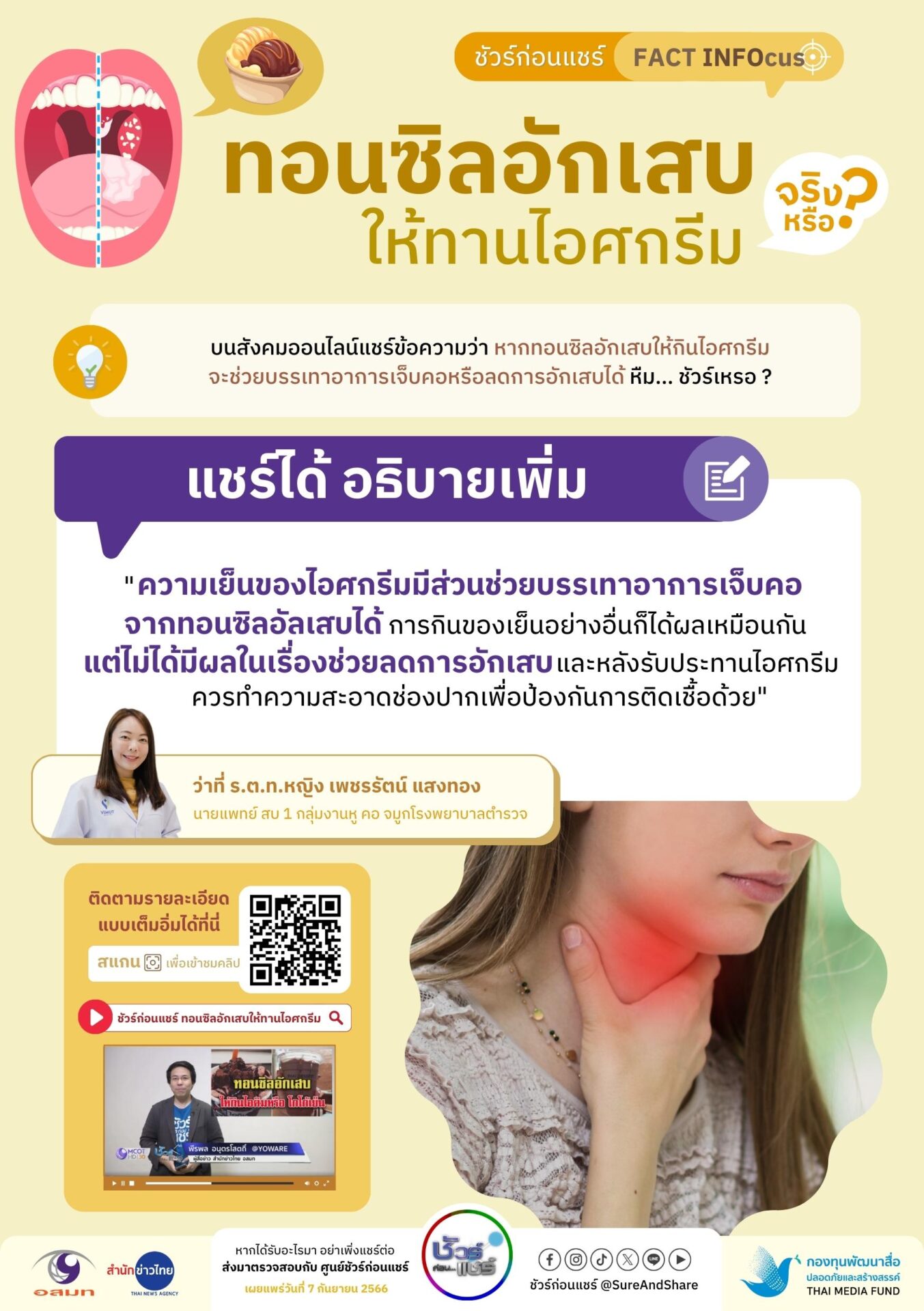 “ความเย็นของไอศกรีมมีส่วนช่วยบรรเทาอาการเจ็บคอจริง แต่การกินของเย็นไม่ได้ช่วยลดการอักเสบตามที่แชร์กัน แพทย์เตือนว่า หลังจากกินไอศกรีมก็ควรทำความสะอาดช่องปากทุกครั้งเพื่อป้องกันการติดเชื้อ”