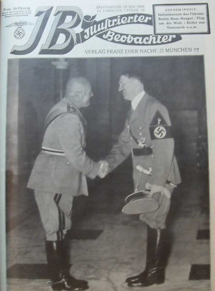 ภาพที่สองคือภาพ อดอล์ฟ ฮิตเลอร์ ผู้นำนาซีของประเทศเยอรมนี กำลังจับมือทักทายกับสิ่งที่ดูคล้ายกับมนุษย์ต่างดาว