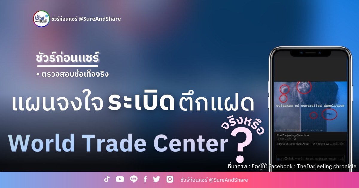 มีข้อมูลเท็จเผยแพร่ทางสื่อสังคมออนไลน์ในสหรัฐอเมริกา ที่อ้างว่าการถล่มของตึก World Trade Center ทั้งสองหลังในเหตุวินาศกรรม 11 กันยายน 2001 นอกจากเป็นเพราะถูกเครื่องบินพุ่งชนแล้ว ยังเกิดจากการจงใจจุดระเบิดภายในอาคารหรือการรื้อถอนด้วยระเบิด (Controlled Demolition) เนื่องจากมีการพบเทอร์ไมต์ ส่วนประกอบสำหรับการผลิตระเบิดอยู่ในฝุ่นที่พบจากซากตึก ตัวตึกยังออกแบบให้ทนต่อการชนจากเครื่องบินตั้งแต่แรก และเป็นไปไม่ได้ที่ความร้อนจากเพลิงไหม้ในอาคารจะทำให้ตึกถล่มลงได้ รวมถึงหลักฐานการได้ยินเสียงระเบิดก่อนตึกถล่มและการกระเด็นของซากตึกออกมาจากชั้นที่้อยู่ต่ำกว่าบริเวณที่ถูกเครื่องบินพุ่งชน ซึ่งน่าจะเป็นผลจากแรงระเบิดภายในอาคารนั่นเอง