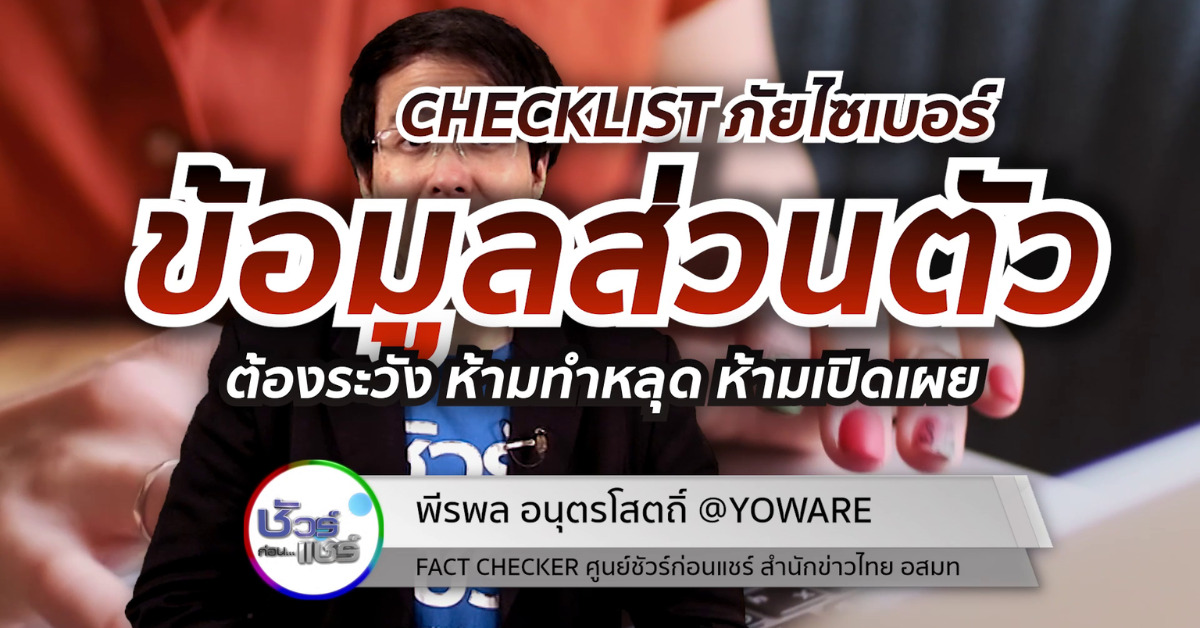 13 กันยายน 2566 – สำเนาบัตรประชาชน สลิปเงินเดือน ใบแจ้งหนี้ ข้อมูลส่วนตัวที่ต้องปกปิด เพราะหากรั่วไหลออกไป อาจถูกมิจฉาชีพนำข้อมูลเหล่านี้มาทำร้ายเรา ?! ร่วมเรียนรู้กลโกงของมิจฉาชีพที่แฝงตัวอยู่ในโลกไซเบอร์ และศึกษาหาทางสร้างภูมิคุ้มกันกับชัวร์ก่อนแชร์ CHECK-LIST ร้อยเรียงเรื่องฮิต ติดอันดับจากชัวร์ก่อนแชร์