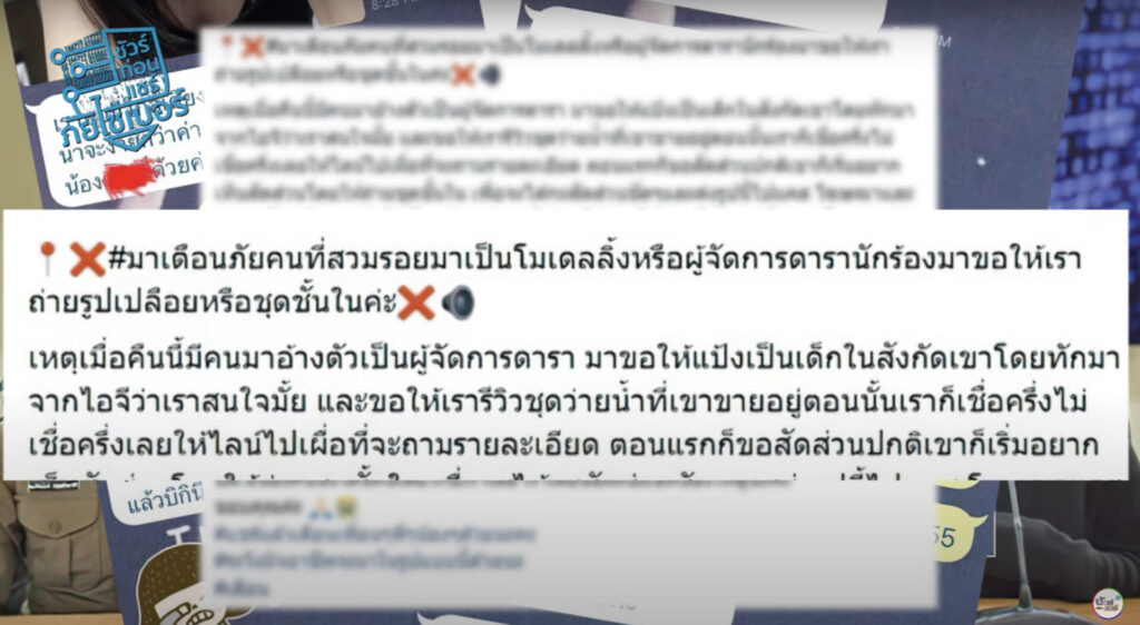 เตือนสาว ๆ ที่ใฝ่ฝันอยากเข้าวงการบันเทิงหรือเป็นพริตตี้ ระวังโมเดลลิ่งเก๊ที่มีสาวประภทสองเป็นนกต่อ ที่หากคุณพลาดหรือเสียรู้ อาจถูกหลอกให้ถ่ายภาพโป๊ ซ้ำภาพเหล่านั้นยังถูกเผยแพร่อยู่ในโลกออนไลน์ !