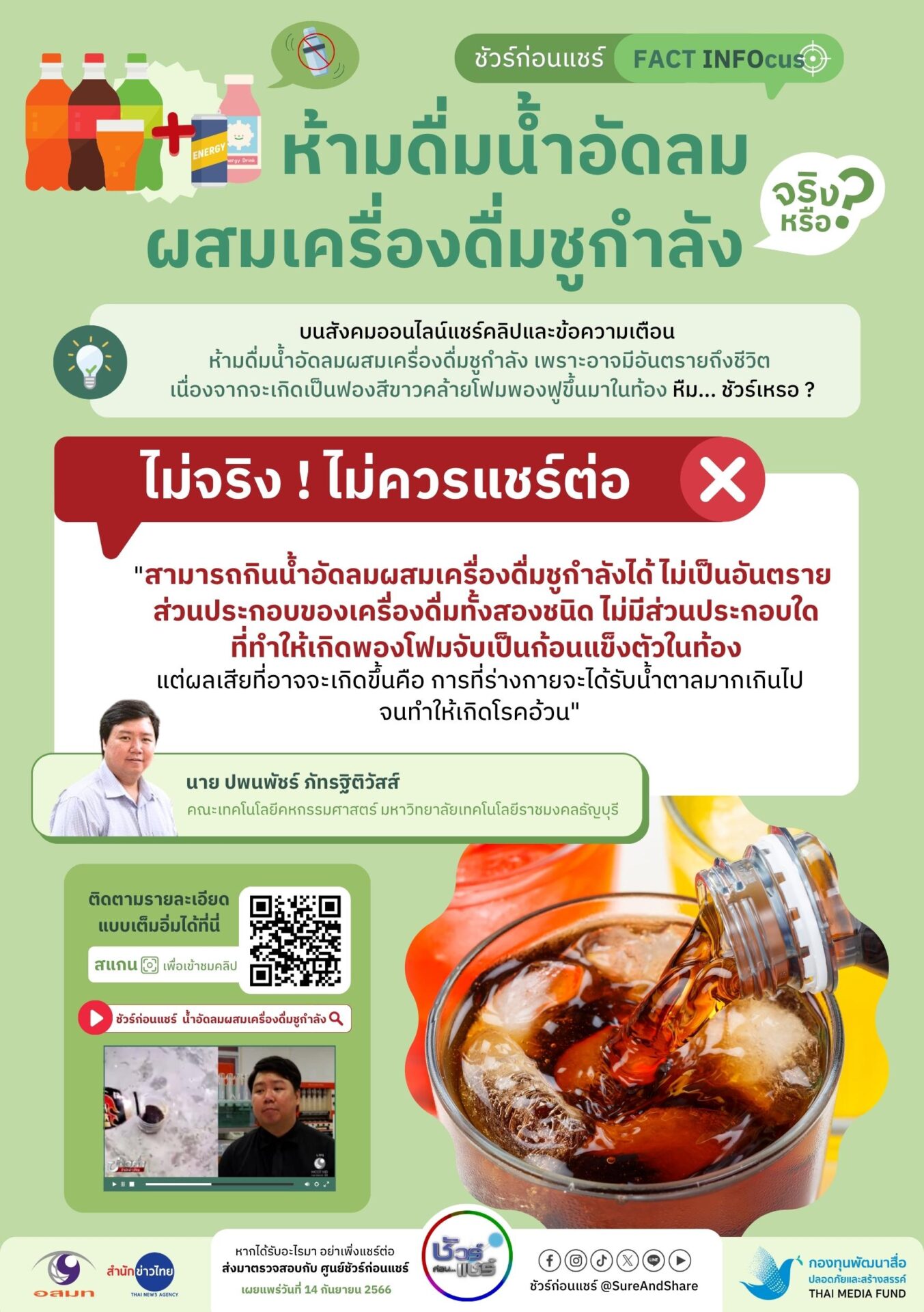 “การกินน้ำอัดลมผสมเครื่องดื่มชูกำลังสามารถทำได้ ไม่เป็นอันตราย ส่วนประกอบของเครื่องดื่มทั้งสองชนิด ไม่มีส่วนประกอบใดที่ทำให้เกิดลักษณะดังกล่าว ส่วนภาพในคลิปนั้นอาจจะเป็นการทดลองทำ Polyurethane Foam ซึ่งใช้สารที่มีสีน้ำตาลคล้ายกันกับน้ำอัดลม ในความเป็นจริงผลเสียที่จะเกิดขึ้นเมื่อกินน้ำอัดลมผสมเครื่องดื่มชูกำลังก็คือ การที่ร่างกายของเราจะได้รับน้ำตาลมากเกินไปจะทำให้เกิดโรคอ้วนนั่นเอง”