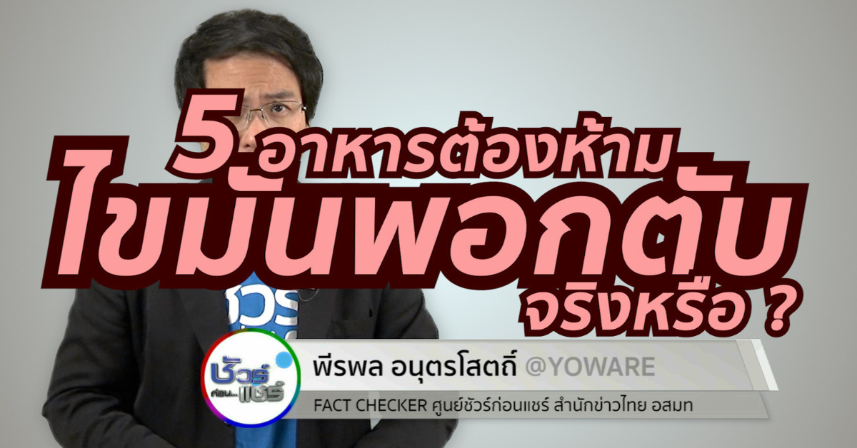 25 กันยายน 2566 – ตามที่มีการแชร์บทความว่า 5 อาหารต้องห้าม สำหรับไขมันพอกตับ ห้ามกินทั้ง น้ำตาล เกลือ แอลกอฮอล์ เนื้อแดง และของทอดนั้น