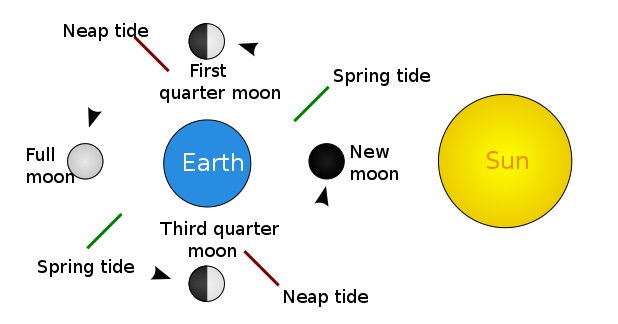 แรงโน้มถ่วงของดวงจันทร์ต่อปรากฏการณ์น้ำขึ้นน้ำลงสูงสุดหรือน้ำเกิด (Spring Tide) ไม่ได้เกิดเฉพาะในคืนที่พระจันทร์เต็มดวงเท่านั้น (ขึ้น 15 ค่ำ) แต่เกิดในคืนเดือนแรมซึ่งมองไม่เห็นดวงจันทร์เช่นกัน (แรม 15 ค่ำ) เนื่องจากเป็นช่วงที่ โลก ดวงจันทร์ และ ดวงอาทิตย์ โคจรในแนวเดียวกัน ทำให้แรงดึงดูดของดวงจันทร์และดวงอาทิตย์ทำให้เกิดน้ำขึ้นน้ำลงสูงสุด ต่างจากคืนขึ้น 8 ค่ำและแรม 8 ค่ำ ซึ่ง โลก ดวงจันทร์และ ดวงอาทิตย์ โคจรอยู่ในตำแหน่งมุมฉาก นำไปสู่ปรากฏการณ์น้ำขึ้นลงน้อยหรือน้ำตาย (Neap Tide)