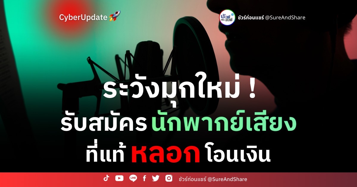 จากสถิติศูนย์บริหารการรับแจ้งความออนไลน์ สำนักงานตำรวจแห่งชาติ ตั้งแต่วันที่ 1 มีนาคม 2565 – วันที่ 30 กันยายน 2566 พบว่า การหลอกลวงโอนเงินเพื่อหารายได้เสริมจากการทำกิจกรรม มีผู้เสียหายแจ้งความออนไลน์กว่า 44,250 เรื่อง หรือคิดเป็น 13.20% จากเรื่องการรับแจ้งความทั้งหมด สูงเป็นลำดับที่ 2 รองจากการหลอกลวงซื้อขายสินค้าออนไลน์ โดยมีมูลค่าความเสียหายกว่า 5,425 ล้านบาท สูงเป็นลำดับที่ 3 ของมูลค่าความเสียหายทั้งหมด รองลงมาจากการหลอกลวงให้ลงทุน และการหลอกลวงทางโทรศัพท์เป็นขบวนการ (แก๊ง Call Center) และตอนนี้หนึ่งในกลโกงที่มิจฉาชีพนำมาใช้หลอกผู้เสียหาย คือ การรับสมัครนักพากย์เสียงผ่านทางสื่อออนไลน์ โดยใช้รูปนักแสดงหญิงชื่อดังมาแอบอ้าง ทำให้มีคนหลงเชื่อและสูญเสียเงิน วันนี้ ชัวร์ก่อนแชร์ CyberUpdate🚀 จะพาทุกคนไปดูกันว่า กระบวนการของมิจฉาชีพเป็นอย่างไร