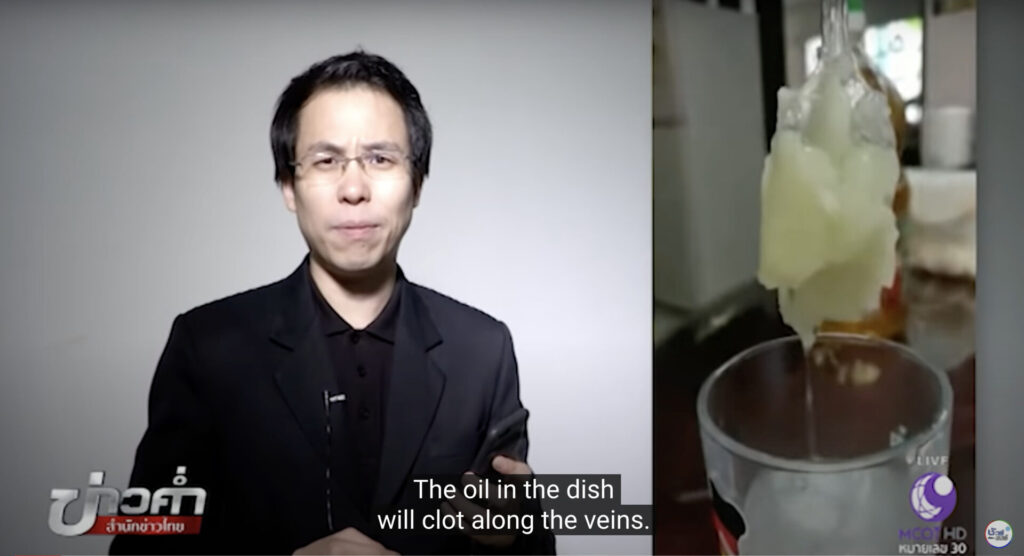 เมื่อน้ำเย็นเจออุณหภูมิในปากจะถูกเปลี่ยนให้เป็นอุณหภูมิที่เหมาะสมต่อร่างกายคือ 37 องศาเซลเซียส ซึ่งไขมันไม่สามารถเป็นไขได้ในอุณหภูมิดังกล่าว ภาพที่เห็นในคลิปเป็นเพียงการทดลองว่าเมื่อน้ำบางประเภทถูกอุณหภูมิที่ต่ำกว่าจะทำให้เป็นไข หากใช้น้ำอุ่นเลียนแบบอุณหภูมิร่างกายก็ไม่มีผลให้เกิดเป็นไข จึงควรระวังการกินไขมันมากกว่ากลัวว่าไขมันจะจับตัวเป็นไขในร่างกาย