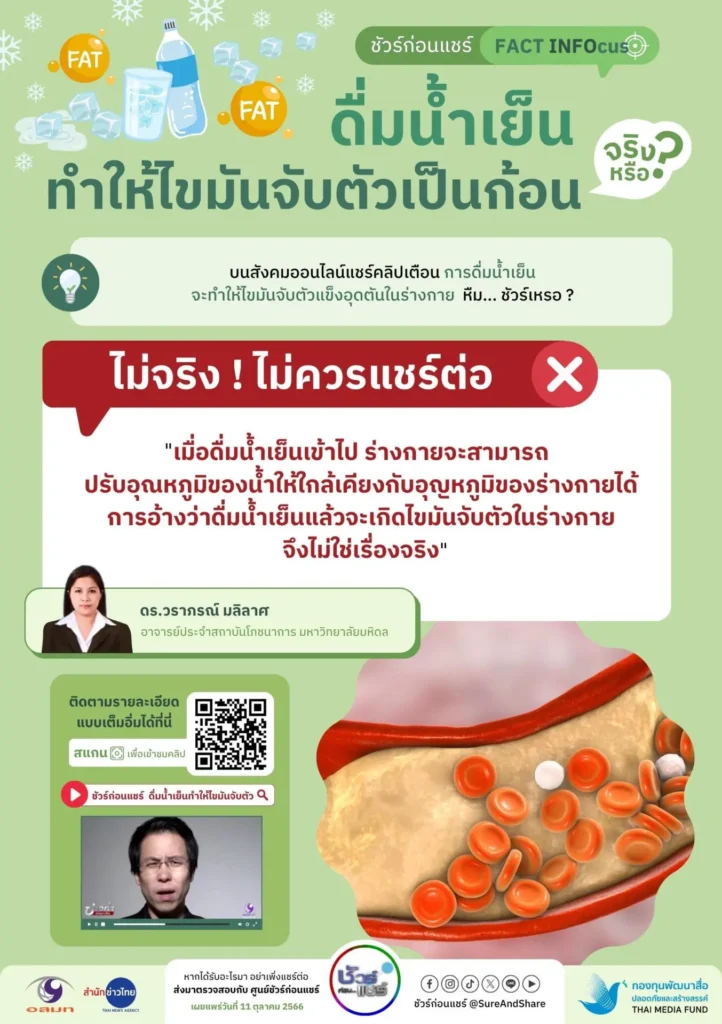 ตามที่มีการแชร์คลิปเตือนว่า การดื่มน้ำเย็นจะทำให้ไขมันจับตัวแข็งอุดตันในร่างกายนั้น