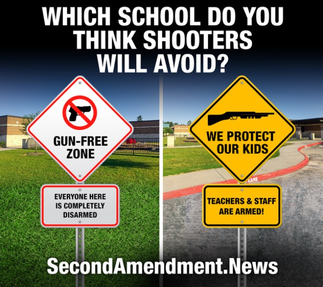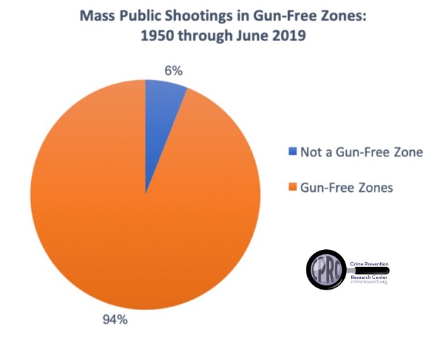สถิติที่กล่าวอ้างนำมาจากงานวิจัยปี 2018 โดยศูนย์วิจัย Crime Prevention Research Center กลุ่มสนับสนุนเสรีภาพด้านการพกอาวุธปืน ที่สำรวจเหตุกราดยิงในสหรัฐอเมริกาตั้งแต่ปี 1950 และพบว่าเหตุกราดยิง 94% เกิดในเขตปลอดอาวุธ พร้อมสรุปว่าเขตปลอดอาวุธกลายเป็นสถานที่เชื้อเชิญให้มือปืนกราดยิงเข้ามาก่อเหตุมากกว่าพื้นที่ที่อนุญาตให้ประชาชนพกปืน