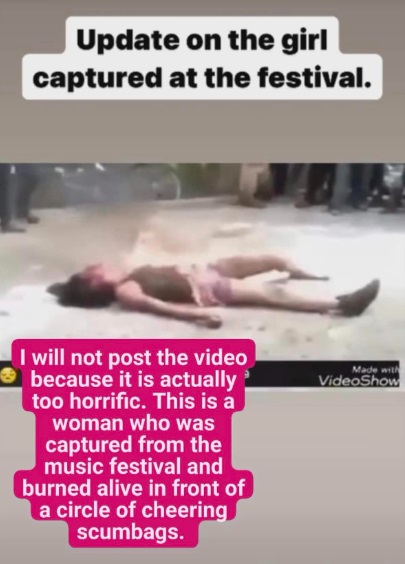 มีคลิปวิดีโอสร้างความเข้าใจผิดเผยแพร่ในต่างประเทศ โดยอ้างว่าตัวประกันหญิงสาวจากเทศกาลดนตรีที่ถูกกองกำลังติดอาวุธฮามาสจับตัวกลับไปยังกาซา ต้องพบกับจุดจบด้วยการถูกเผาทั้งเป็น