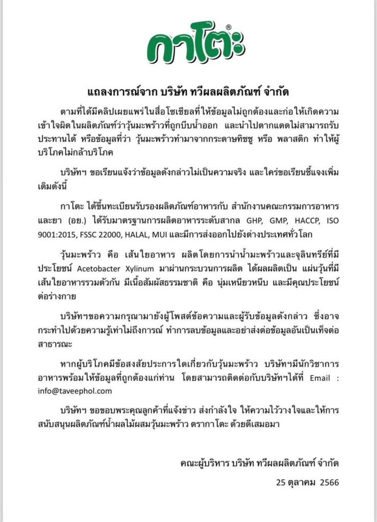 25 ตุลาคม 2566 – ตามที่มีการแชร์คลิปถึงผลิตภัณฑ์ยี่ห้อหนึ่งว่าวุ้นมะพร้าวทำมาจากกระดาษทิชชู่หรือพลาสติก ทำให้ผู้บริโภคไม่กล้าบริโภคนั้น