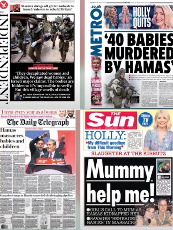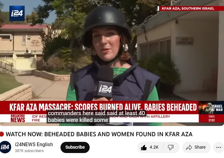 สื่อเจ้าแรกที่เผยแพร่ข่าว “ทารก 40 รายถูกฆ่าตัดหัว” ได้แก่ i24News สำนักข่าวของประเทศอิสราเอล ที่ถ่ายทอดรายงานสดทาง YouTube เมื่อวันที่ 10 ตุลาคม โดยใช้ชื่อวิดีโอว่า Beheaded Babies and Women Found in Kfar Aza โดย นิโคล ซีเดก ผู้สื่อข่าวภาคสนามของ i24News ซึ่งตามติดภารกิจกู้ศพชาวบ้านที่ถูกกลุ่มฮามาสสังหาร รายงานว่าแหล่งข่าวซึ่งเป็นทหารในพื้นที่แจ้งว่า พบศพทารกอย่างน้อย 40 ราย บางศพอยู่ในสภาพที่ศีรษะถูกตัดออกจากร่าง
