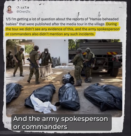 ออเรน ซีฟ ผู้สื่อข่าวของ 972 mag สำนักข่าวท้องถิ่นของอิสราเอลที่มีโอกาสไปร่วมสังเกตการกู้ศพที่ทุ่งสังหารในเมือง Kfar Aza ได้ชี้แจงผ่านทาง X(Twitter) ว่า จากการสัมภาษณ์ทหารที่อยู่ในพื้นที่ ไม่พบการเอ่ยถึงศพทารกถูกตัดหัว 40 รายแต่อย่างใด โฆษกและผู้บัญชาการกองทัพก็ไม่ได้กล่าวถึงประเด็นดังกล่าวเช่นเดียวกัน
