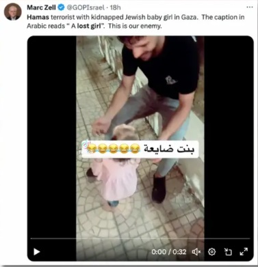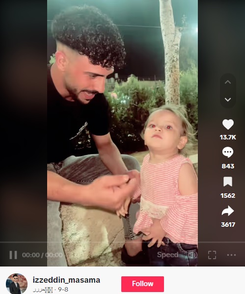 คลิปวิดีโอตัวที่สองที่แชร์ผ่านทาง TikTok มีชื่อว่า “ฮามาสลักพาตัวเด็กหญิงชาวยิว” เป็นภาพชายที่พูดภาษาอาหรับ 2 คน กำลังคุยกับเด็กหญิงที่ดูเหมือนกำลังหลงทาง