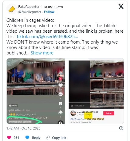 คลิปวิดีโอตัวแรกที่แชร์ผ่านทาง TikTok มีชื่อว่า “ฮามาสจับเด็กขังในกรง” เป็นภาพเด็ก 5 คนถูกขังอยู่ในกรงสำหรับเลี้ยงไก่