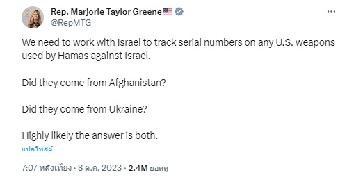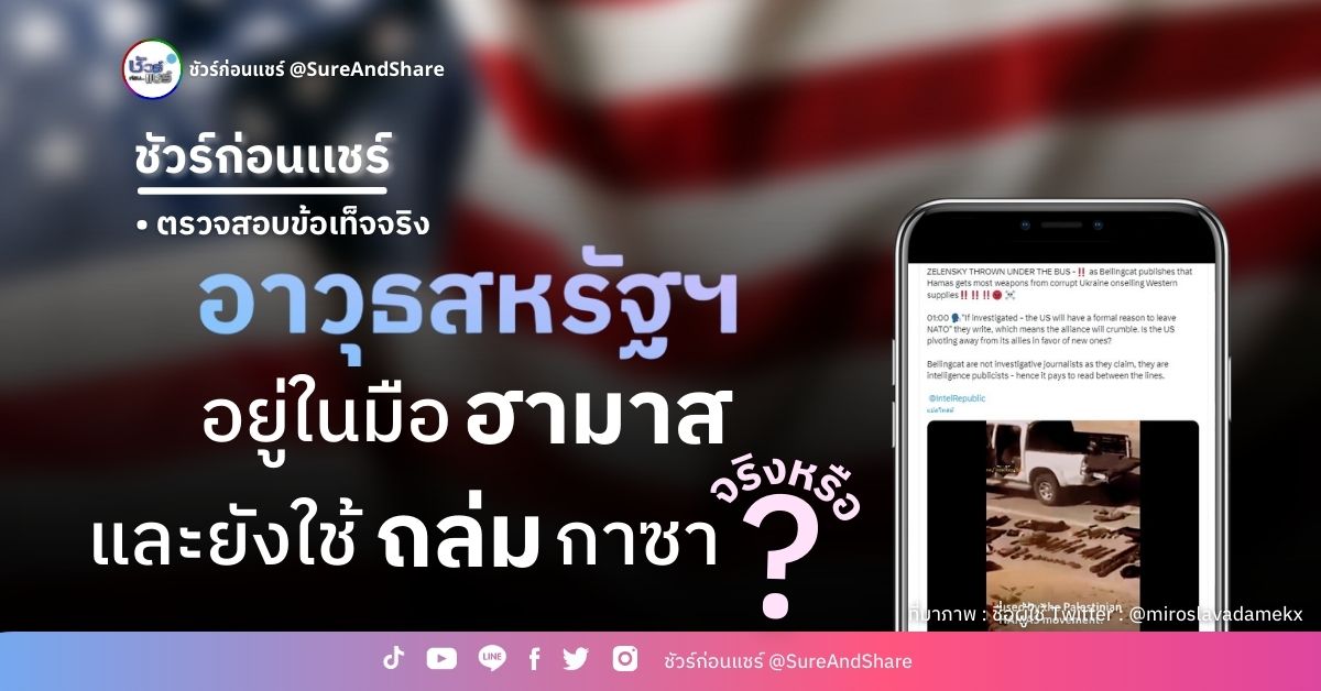มีข้อมูลเท็จเผยแพร่ในสื่อสังคมออนไลน์ในต่างประเทศ โดยอ้างว่าอาวุธที่ใช้ในสงครามอิสราเอล-ฮามาส ทั้งที่กลุ่มฮามาสใช้โจมตีอิสราเอลเมื่อวันที่ 7 ตุลาคม และระเบิดที่ถล่มโรงพยาบาลในกาซาเมื่อวันที่ 17 ตุลาคม ล้วนเป็นอาวุธจากกองทัพสหรัฐอเมริกาที่ตกไปอยู่ในมือของผู้ก่อการร้าย ทั้งอาวุธที่กองทัพสหรัฐอเมริกาทิ้งไว้ที่ประเทศอัฟกานิสถาน และอาวุธที่มอบให้กับยูเครน แต่ถูกนำไปขายต่อในตลาดค้าอาวุธมือสองเพราะการทุจริตภายในกองทัพยูเครน