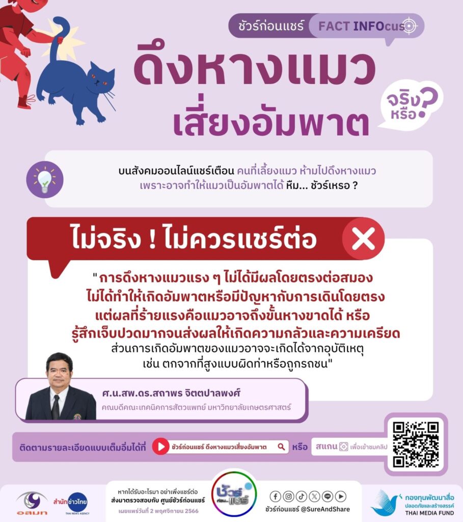 ตามที่มีการแชร์ข้อความเตือนว่าคนที่เลี้ยงแมว ห้ามไปดึงหางแมวเพราะอาจทำให้แมวเป็นอัมพาตได้นั้น