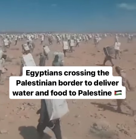 มีคลิปวิดีโอบิดเบือนเผยแพร่ทางสื่อสังคมออนไลน์ในต่างประเทศ โดยคลิปแรกอ้างว่ารถบรรทุกสิ่งของบรรเทาทุกข์นับร้อยคัน ไม่สามารถนำสิ่งของช่วยเหลือไปยังฉนวนกาซาได้ เนื่องจากทางการอิสราเอลสั่งห้ามเปิดด่านราฟาห์ จุดผ่านแดนระหว่างฉนวนกาซาและประเทศอียิปต์ จนเกิดการแชร์คลิปประชาชนอียิปต์เดินเท้าข้ามแดนเพื่อนำสิ่งของจำเป็นไปมอบให้กับชาวปาเลสไตน์ในฉนวนกาซาด้วยตนเอง