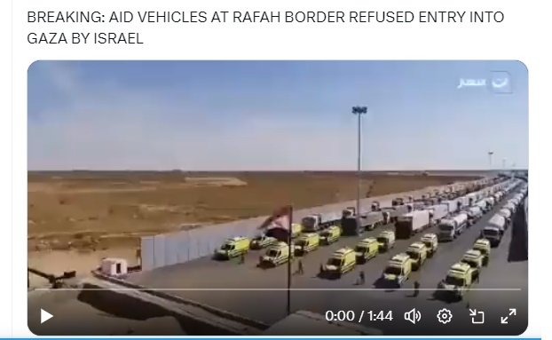 - คลิปแรกเป็นภาพขบวนรถบรรทุกสิ่งของบรรเทาทุกข์จอดหน้าด่านราฟาห์เมื่อปี 2021 หรือ 2 ปีก่อนสงครามอิสราเอล-ฮามาส
