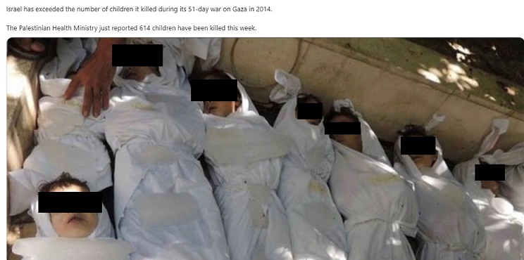 มีข้อมูลบิดเบือนเผยแพร่ทางสื่อสังคมออนไลน์ในต่างประเทศ โดยมีการแชร์ภาพถ่าย 3 ภาพที่อ้างว่าเป็นชะตากรรมอันโหดร้ายที่เกิดกับเด็กชาวปาเลสไตน์ จากการโจมตีฉนวนกาซาอย่างต่อเนื่องของทางการอิสราเอล ในสงครามอิสราเอล-ฮามาสที่เปิดฉากโจมตีตั้งแต่ต้นเดือนตุลาคม 2023 เป็นต้นมา