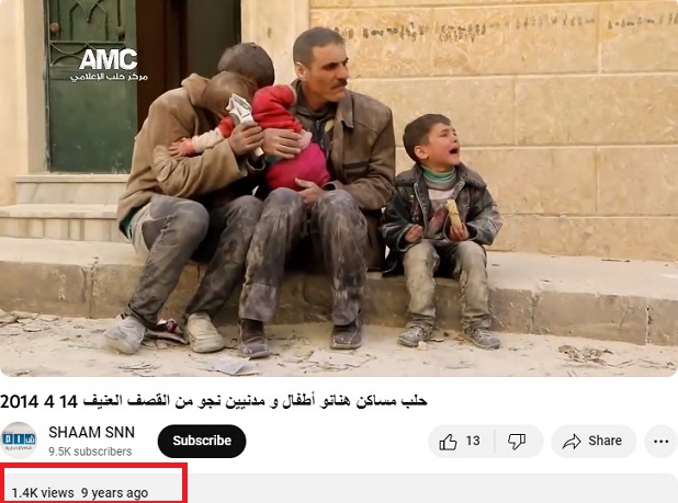คลิปเดียวกันที่โพสต์ทาง YouTube ระบุว่า “ชาวเมืองอะเลปโป ทั้งพลเรือนและเด็กรอดชีวิตจากการโจมตีด้วยระเบิดที่รุนแรง”