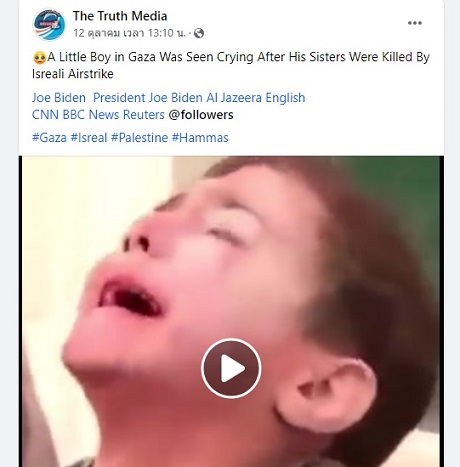 ข้อความและวิดีโอที่โพสต์ทาง Facebook ระบุว่า “เด็กชายในกาซากำลังร่ำไห้หลังสูญเสียพี่สาวน้องสาวจากการโจมตีทางอากาศโดยฝ่ายอิสราเอล”