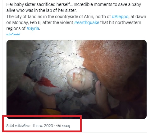 ข้อมูลจากคลิปต้นฉบับระบุว่า “ช่วงเวลาอันเหลือเชื่อระหว่างการช่วยทารกที่ยังมีชีวิตรอดในซากตึก เด็กได้รับการปกป้องจากตัวของพี่สาว ในเหตุแผ่นดินไหวครั้งใหญ่ทางตะวันตกเฉียงเหนือของประเทศซีเรีย #Aleppo #Syria”