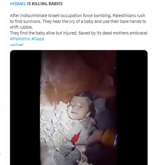 ข้อความประกอบคลิปวิดีโอที่ถูกแชร์กล่าวหาว่า “อิสราเอลสังหารเด็ก จากการทิ้งระเบิดอย่างไม่เลือกเป้าหมาย ชาวปาเลสไตน์ออกมาช่วยกันค้นหาผู้รอดชีวิต พวกเขาได้ยินเสียงร้องของทารกดังมาจากซากตึกที่ถล่ม จึงช่วยกันคุ้ยซากด้วยมือเปล่า จนพบเด็กทารกที่ติดอยู่ในซาก แม้จะเจ็บหนักแต่ยังคงมีชีวิต เพราะได้รับการปกป้องจากอ้อมกอดของแม่ที่ยอมสละชีวิตเพื่อลูกน้อย #Palestine #Gaza”