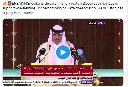 มีคลิปวิดีโอข้อมูลบิดเบือนเผยแพร่ทางสื่อสังคมออนไลน์ในต่างประเทศ โดยอ้างว่า ตะมีม บิน ฮะมัด อัษษานี เจ้าผู้ครองรัฐกาตาร์ ได้ประกาศต่อที่ประชุมเพื่อเตรียมระงับการส่งออกก๊าซธรรมชาติเหลว (Liquefied Natural Gas) หากอิสราเอลไม่ยุติการโจมตีกาซา พร้อมขู่จะทำให้โลกอยู่ในสภาวะขาดแคลนพลังงานก๊าซธรรมชาติเพื่อสนับสนุนเสรีภาพของชาวปาเลสไตน์