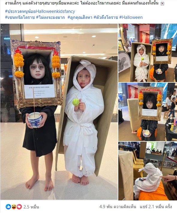 - ภาพที่สองเป็นกิจกรรมในเทศกาลฮาโลวีนที่เมืองไทยเมื่อปี 2022 ที่เด็กแต่งแฟนซีด้วยชุดที่คล้ายกับถุงบรรจุศพ
