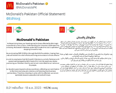 ส่วน McDonald ที่เปิดสาขาในประเทศคูเวต โอมาน ปากีสถาน และสหรัฐอาหรับเอมิเรตส์ ก็นำรายได้ส่วนหนึ่งไปบริจาคเพื่อบรรเทาทุกข์ให้กับผู้คนในฉนวนกาซาเช่นกัน