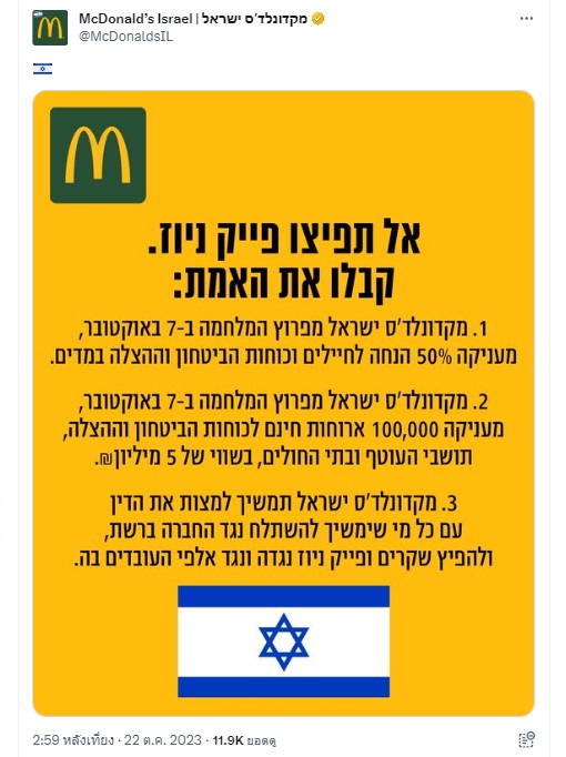 มีข้อมูลบิดเบือนเผยแพร่ทางสื่อสังคมออนไลน์ในสหรัฐอเมริกา เมื่อมีคลิปวิดีโอที่อ้างว่า McDonald ร้านอาหารฟาสต์ฟูดชื่อดังในสหรัฐอเมริกา ทำการเปลี่ยนกระดาษห่อเมนูอาหารเป็นสีฟ้าและสีขาวคล้ายธงชาติอิสราเอล เพื่อสนับสนุนการรุกรานกาซาของกองทัพอิสราเอล